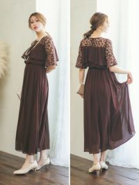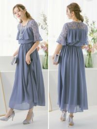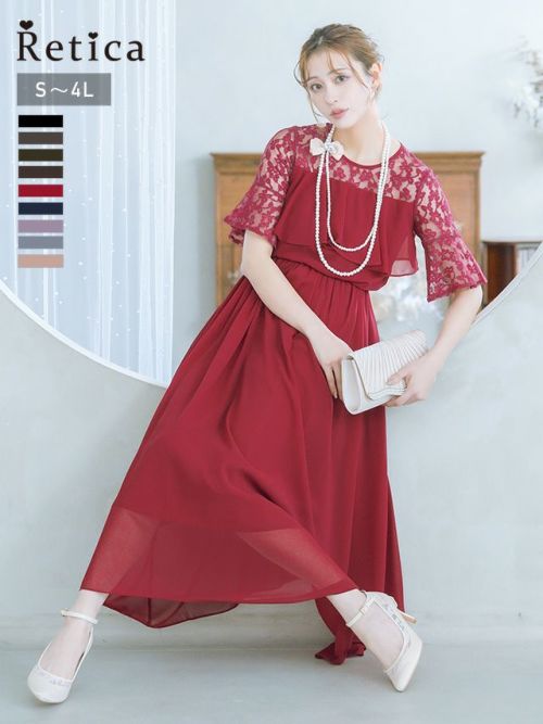 5. レース袖胸元フリルシフォンフレアロングパーティードレス (Sサイズ~4Lサイズ)