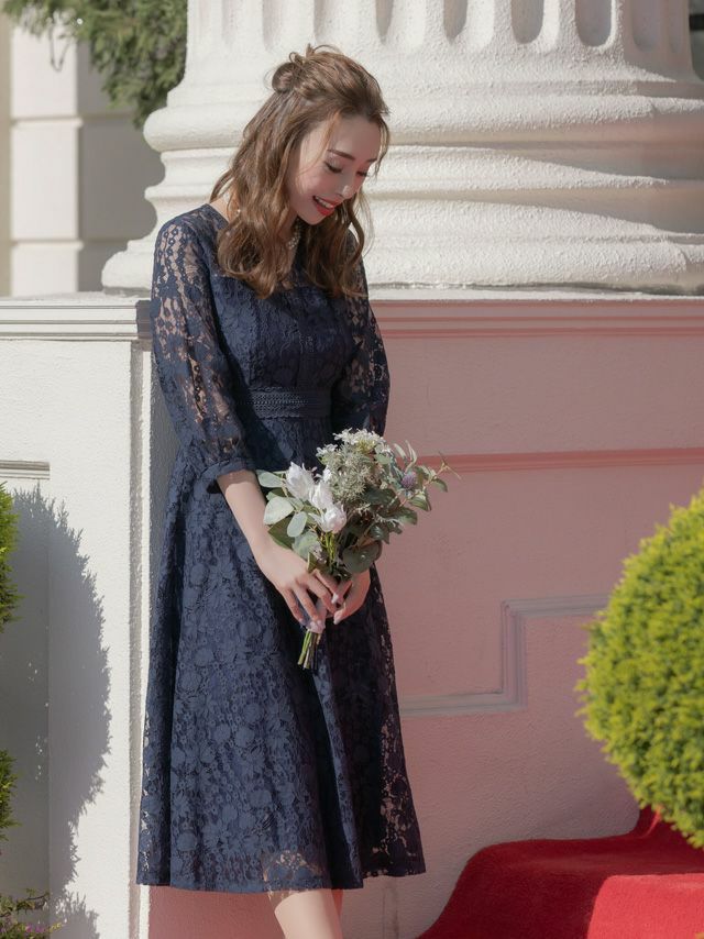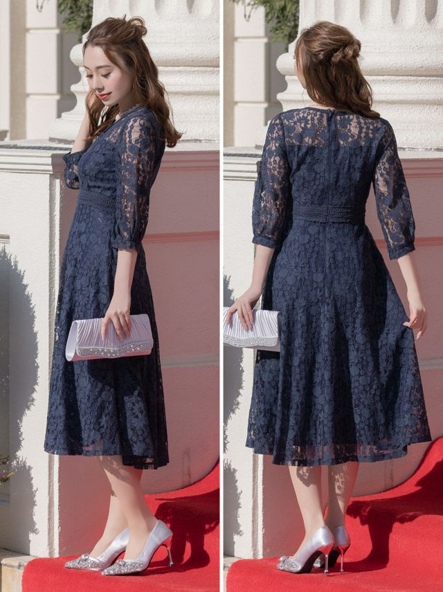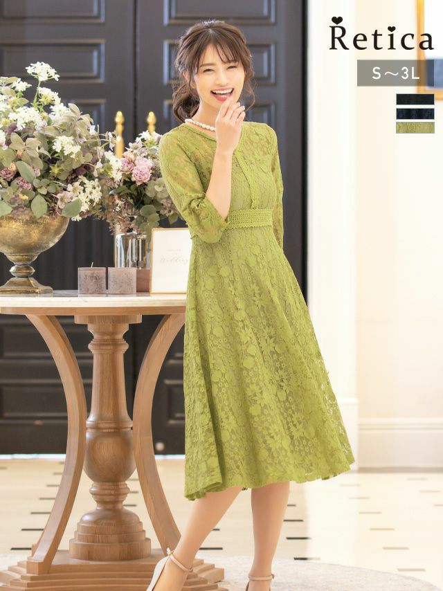 上品総レースドレス☆ [SALE] 総レース袖あり膝丈フレアワンピースパーティードレス (Sサイズ~3Lサイズ)