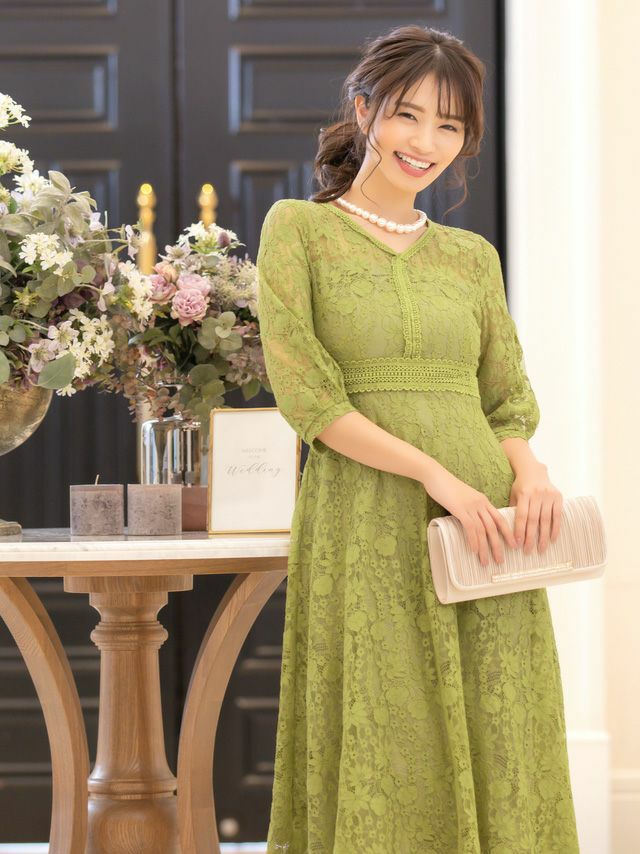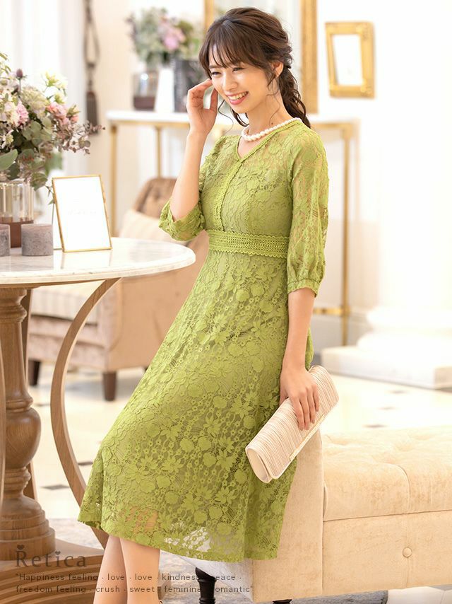 きれいめ総レースワンピース(^^♪ [SALE] 花柄総レース袖ありVネックミモレ丈Aラインスカートパーティードレス (Sサイズ~3Lサイズ)