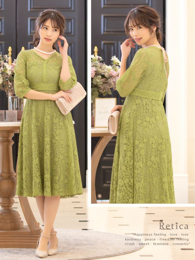 ふくらはぎの中間くらいまでが隠れ、可愛らしく華やかすぎず、上品で女性らしい印象になるドレスです。