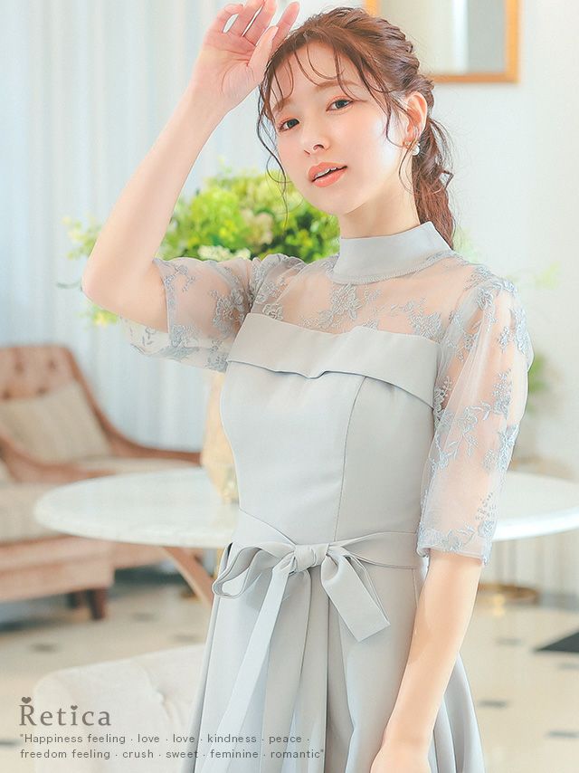 レースとリボンで魅せる、クラシカルな華やぎ。 [SALE] ビスチェ風デザインハイネックレース五分袖ミモレ丈パーティードレス (XSサイズ~4Lサイズ)