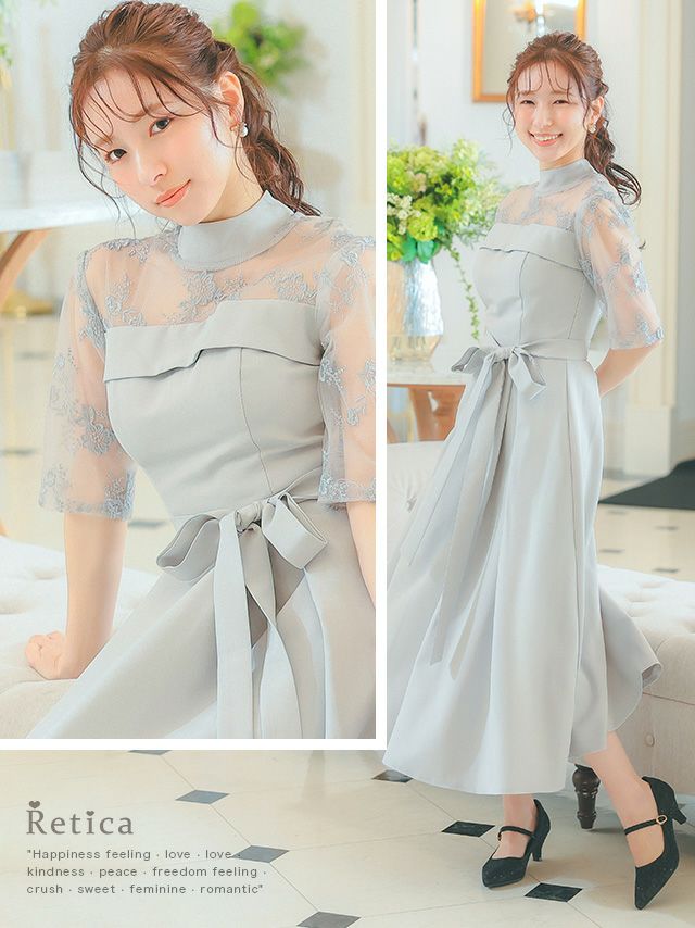 11/18再入荷★品格をまとう、レース×リボンの美シルエット♪ [SALE] ハイネックレース七分袖ミモレ丈パーティードレス (XSサイズ~4Lサイズ)