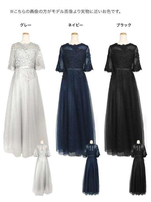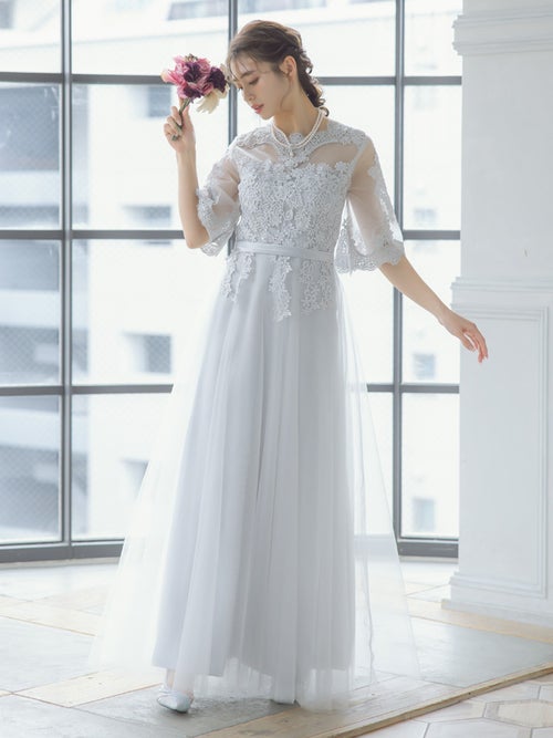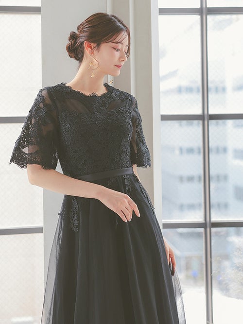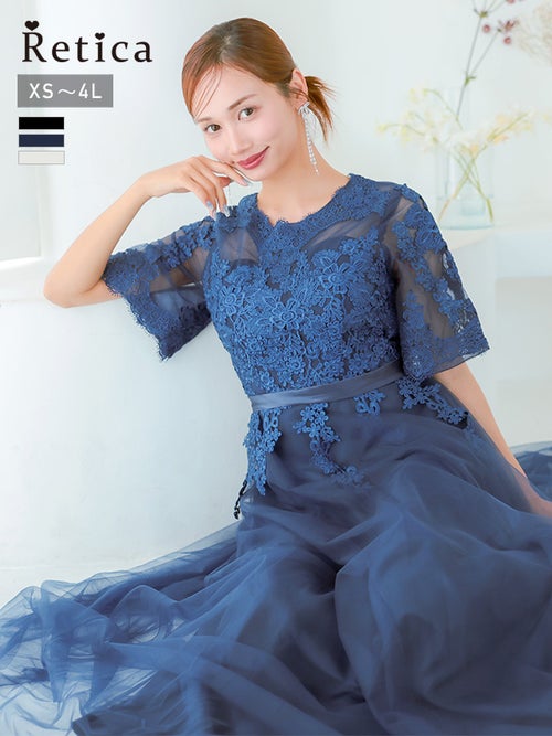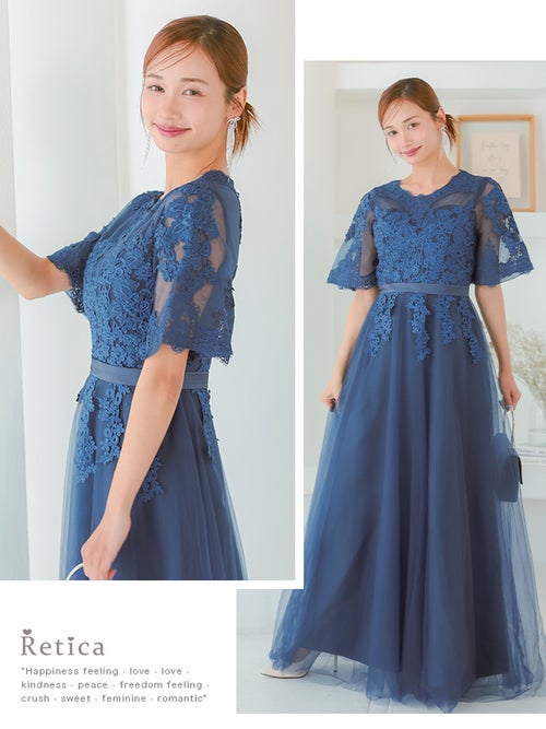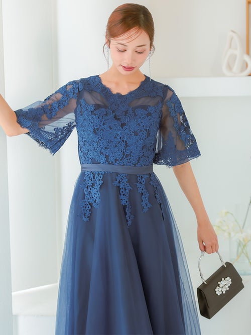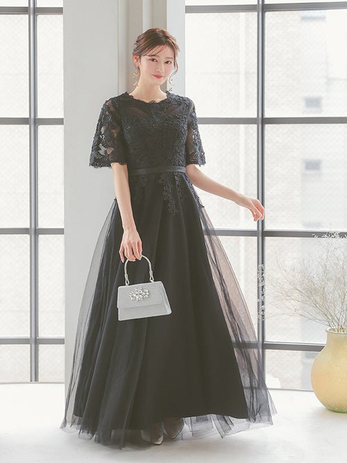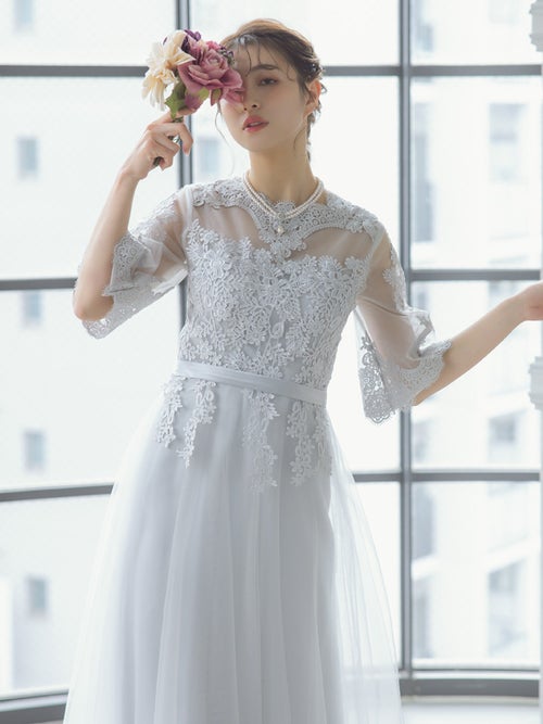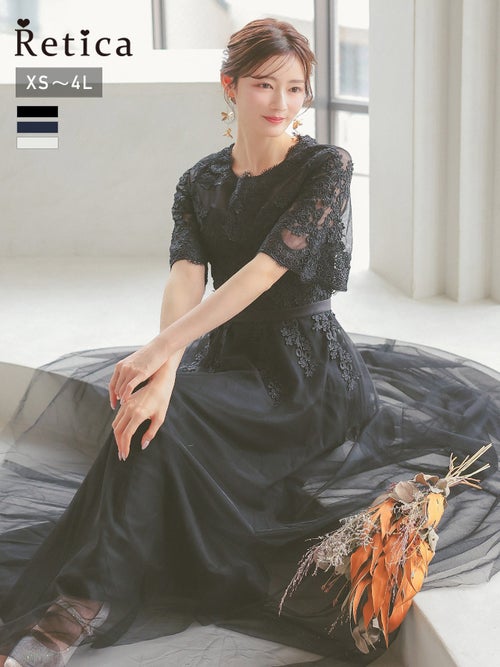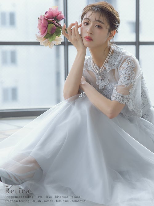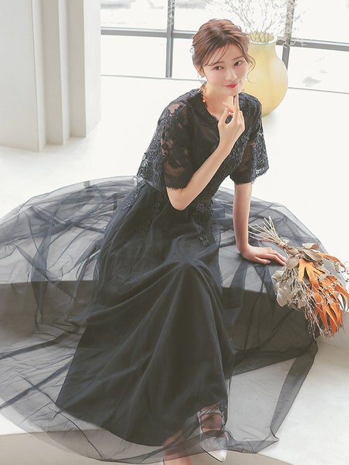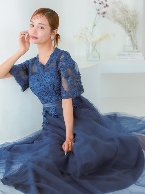 繊細なレース刺繍と、ボリュームのあるチュールスカートがエレガントな印象の一着!華やかなドレスをお探しの方におすすめです◎スカートは長めの丈感なので、ヒールのあるパンプスと合わせると、よりバランスよく上品に着こなせると思います!