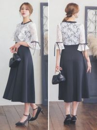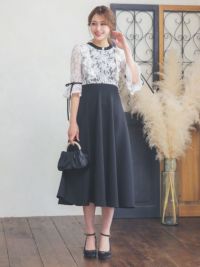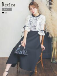 3. [SALE] リボン付き七分袖パールボタン付きレース切り替えミモレ丈ワンピースパーティードレス (Sサイズ~XXLサイズ)
