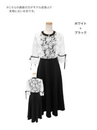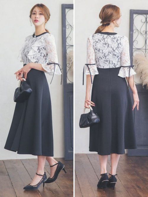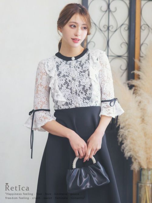5. [SALE] リボン付き七分袖パールボタン付きレース切り替えミモレ丈ワンピースパーティードレス (Sサイズ~XXLサイズ)