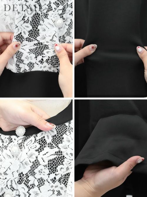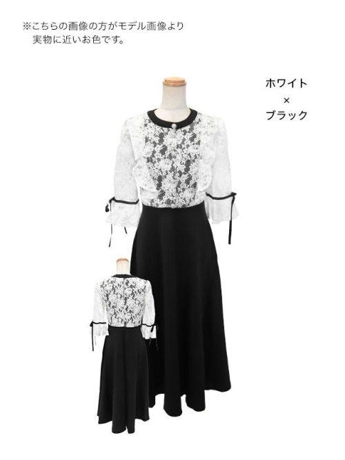 リボン付き七分袖パールボタン付きレース切り替えミモレ丈ワンピースパーティードレスのカラーバリエーション