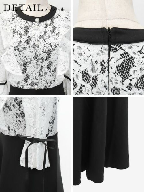 リボン付き七分袖パールボタン付きレース切り替えミモレ丈ワンピースパーティードレスのイメージ画像3