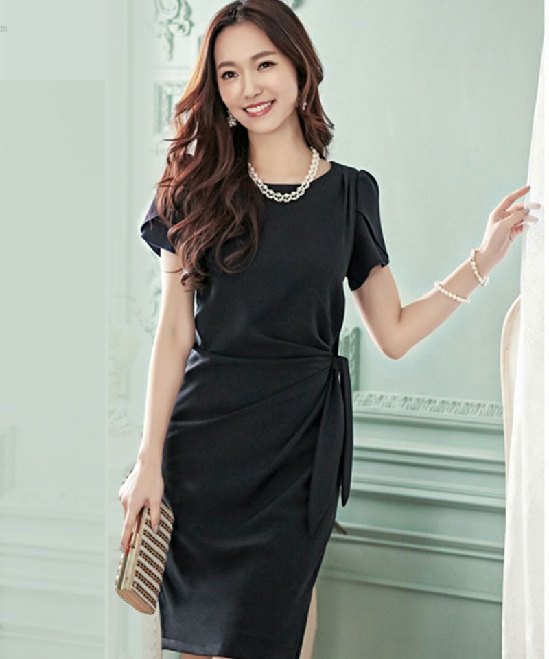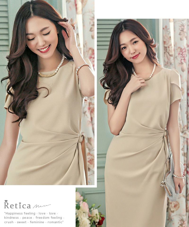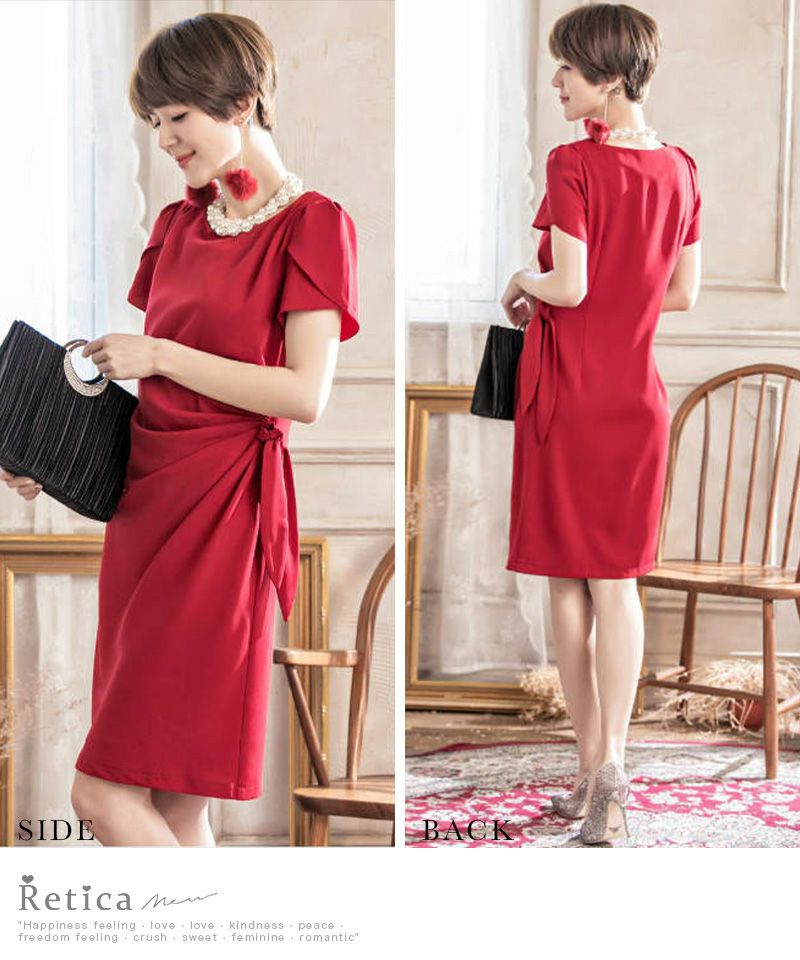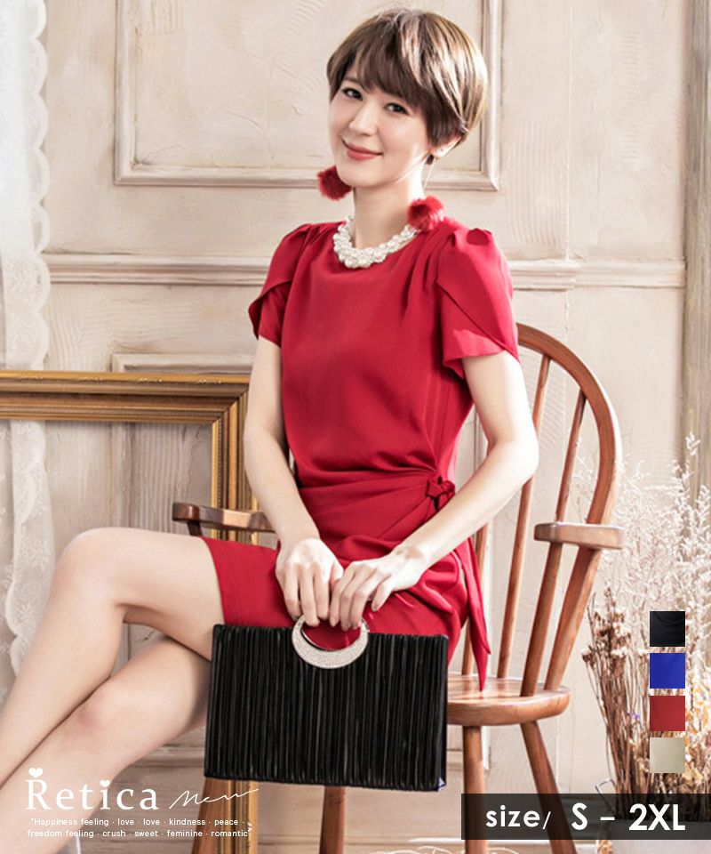 シンプル大人の色っぽドレス♪ ペタルパフスリーブウエストリボンミディプチプラパーティードレス (Sサイズ~XXLサイズ)