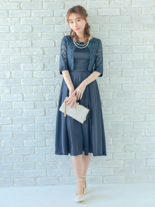 3. [SALE] レース七分袖サテンワンピースミモレ丈パーティードレス (XSサイズ~4Lサイズ)