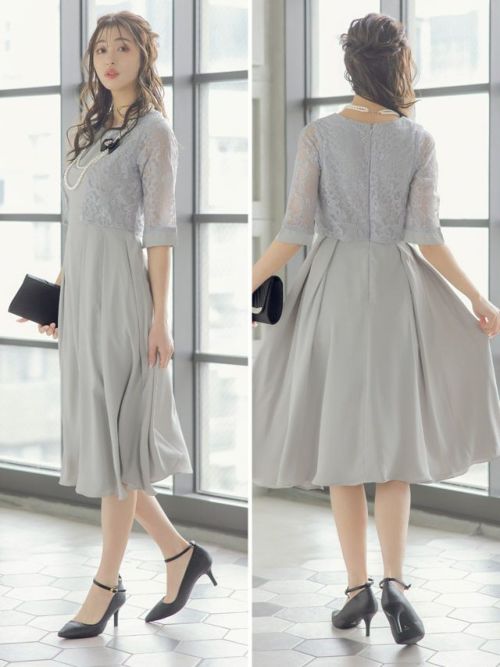 5. [SALE] レース七分袖サテンワンピースミモレ丈パーティードレス (XSサイズ~4Lサイズ)