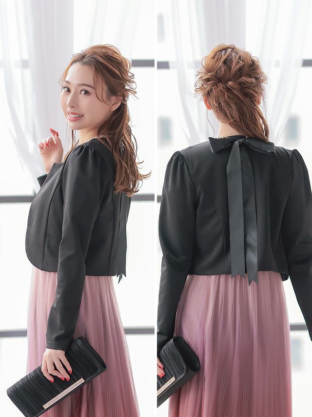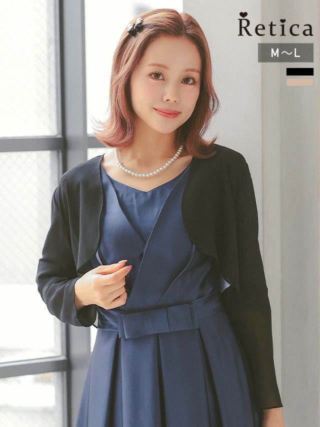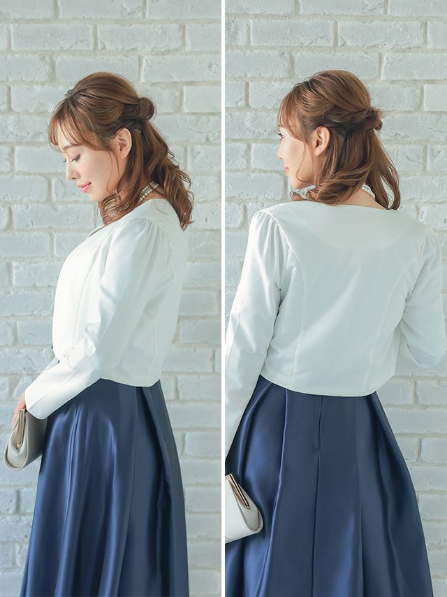 明るい色のドレスを着用している場合は、黒やネイビーのボレロがシルエットを細く見せてくれるので、体型カバーもばっちり。