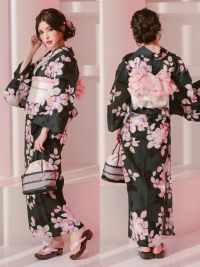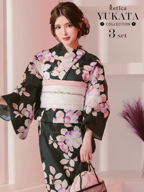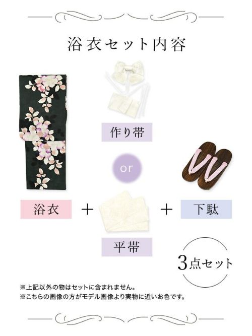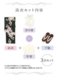 3. [SALE] 黒緑にニュアンス椿 大人の3点セットレディース浴衣(浴衣+平帯or作り帯+下駄)