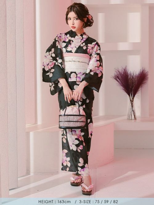 黒緑にニュアンス椿が映える大人可愛い浴衣