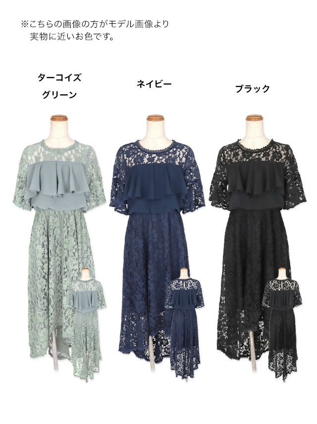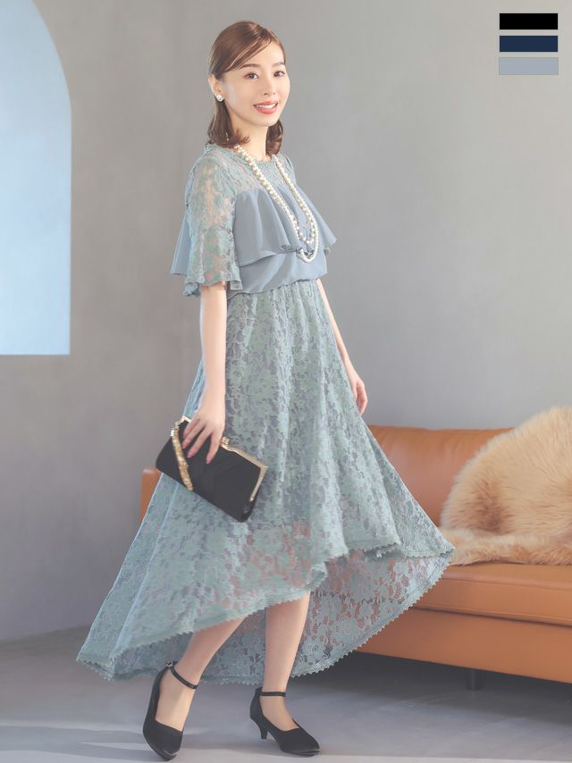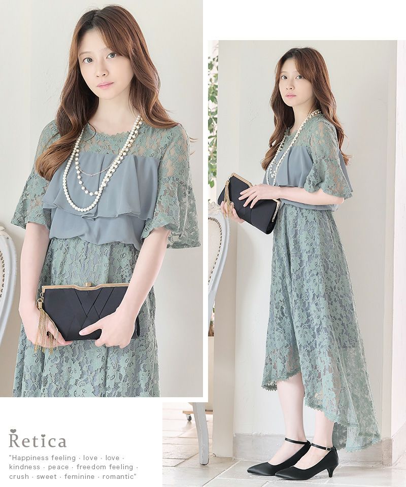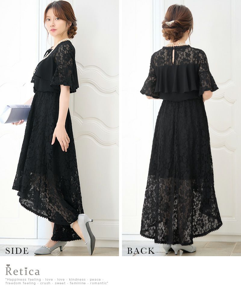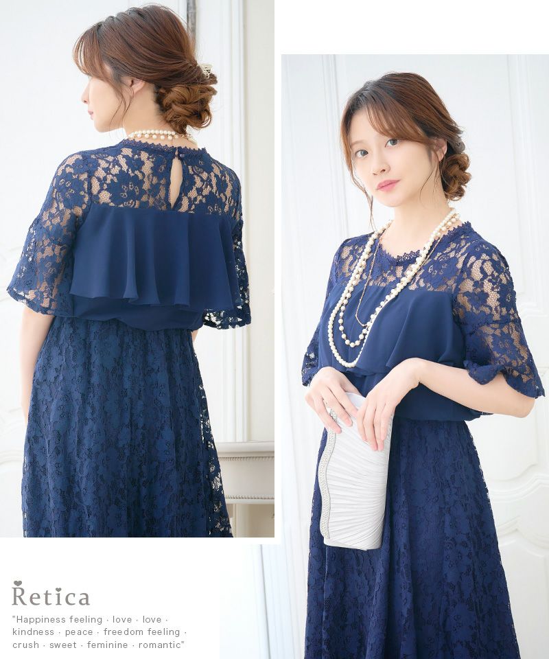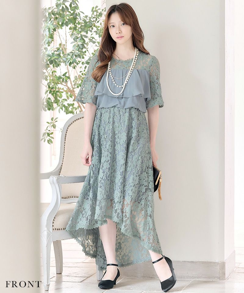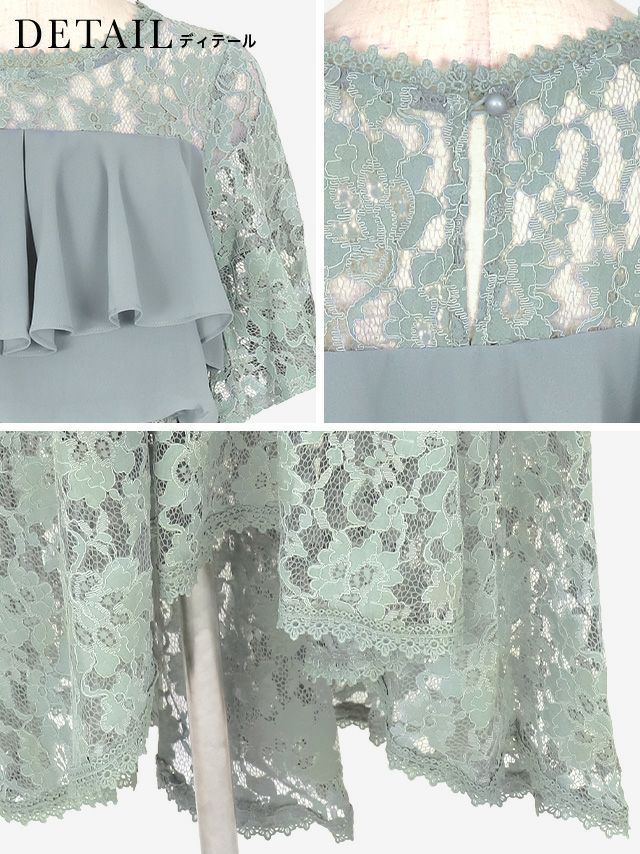 クルーネックレーススリーブカシュクール風オールインワンパーティードレス