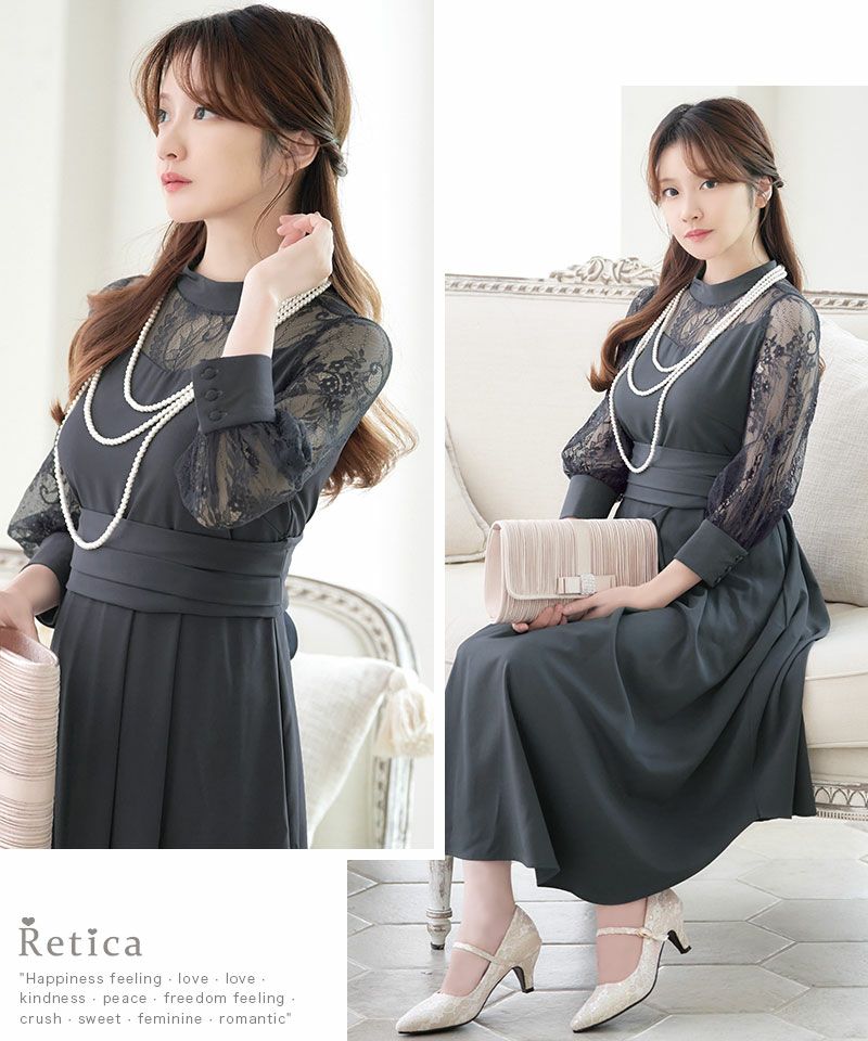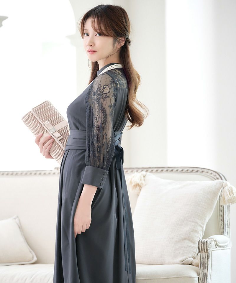 4. レーススリーブアシンメトリーバックレースアップパーティーワンピースドレス (Sサイズ/Mサイズ)(小澤美里)