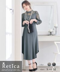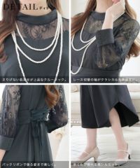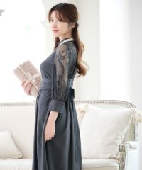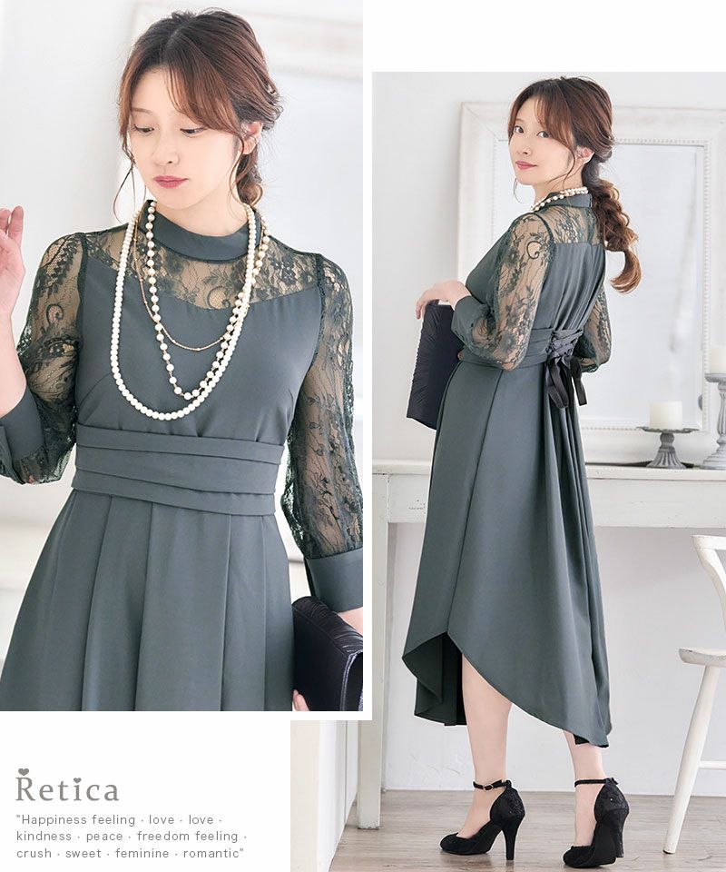 上品な大人の高級感♪ レーススリーブアシンメトリーバックレースアップパーティーワンピースドレス (Sサイズ/Mサイズ)(小澤美里)