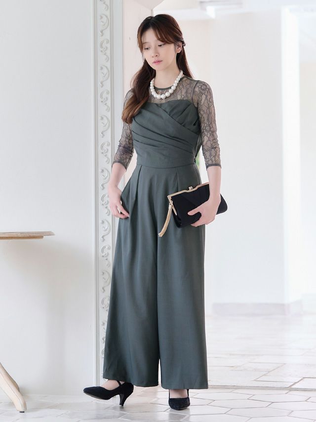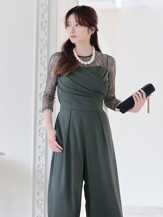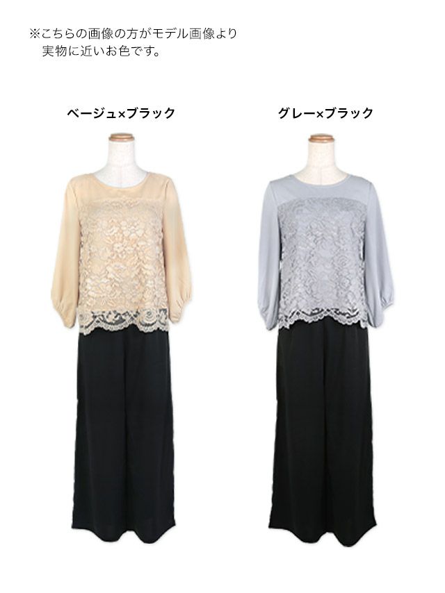 落ち着いた雰囲気のパンツドレス♪ [SALE] ビスチェ風シアーレース生地ワイドパンツドレス(S~4L)(ブルーグリーン/ブラック/チャコールグレー)