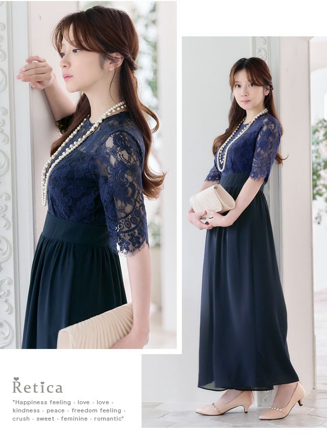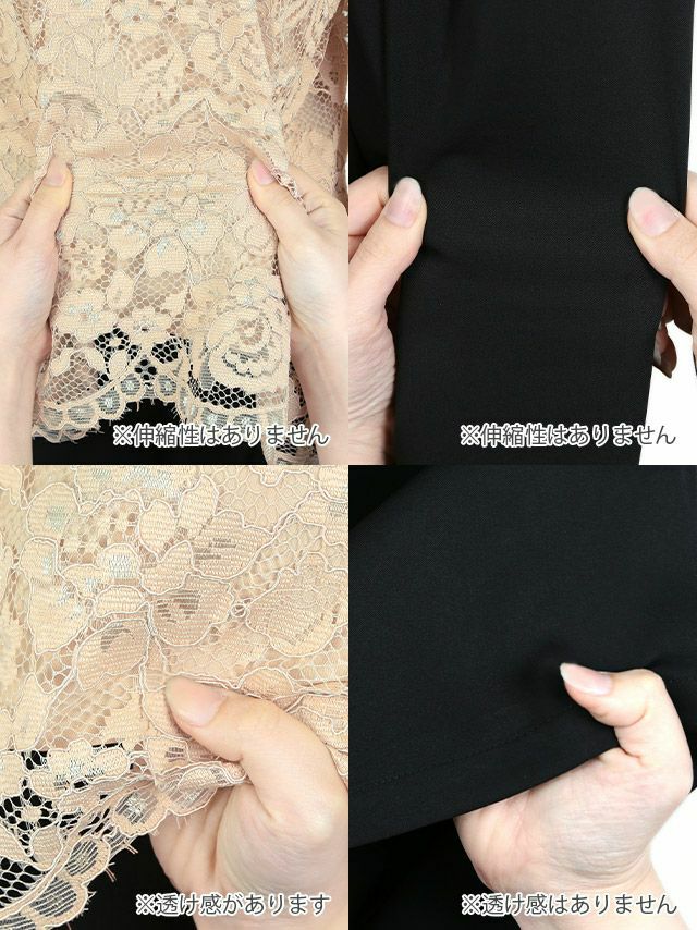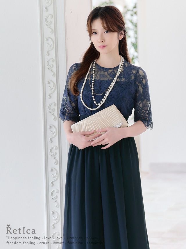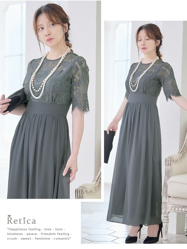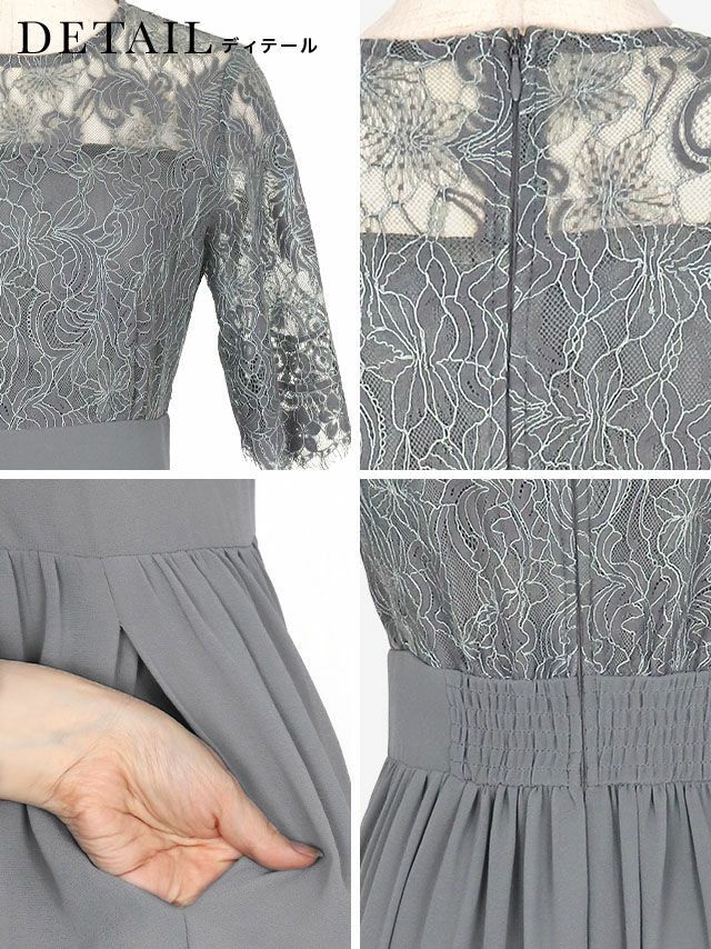 繊細なレース素材でエレガント♪ [SALE] ウエストゴムレース袖ありワイドプチプラパーティードレス (Sサイズ~3Lサイズ)