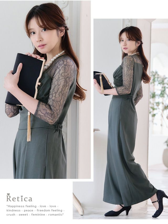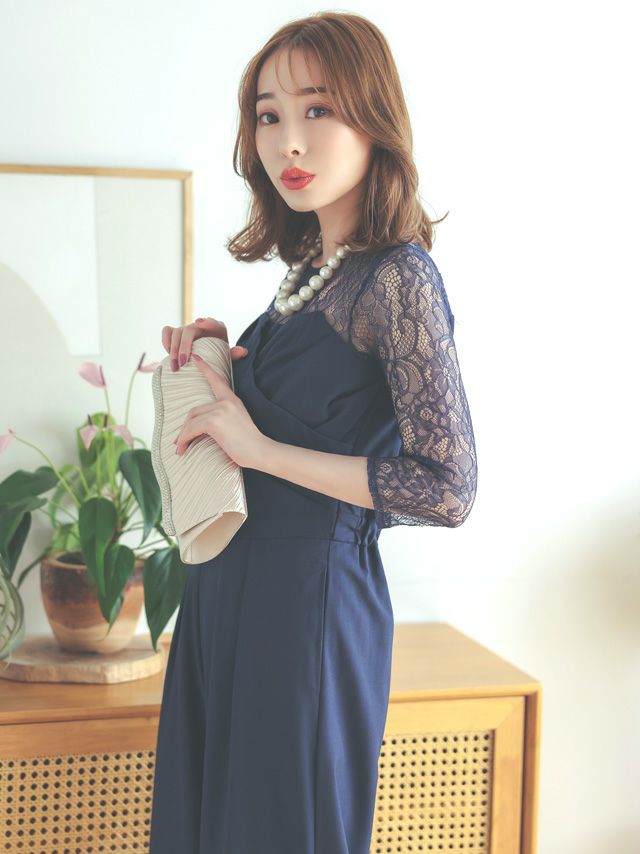 スタイルアップ効果抜群♪ [SALE] クルーネックレーススリーブカシュクール風オールインワンパーティードレス (Sサイズ~4Lサイズ) (小澤美里)