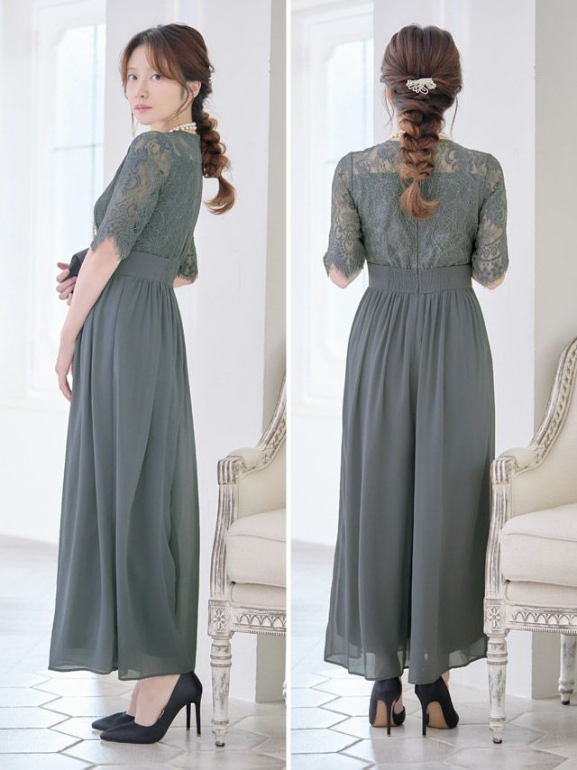 シンプルで上品なデザイン♪ [SALE] レーススリーブワイドパンツプチプラパーティードレス (Sサイズ~3Lサイズ)