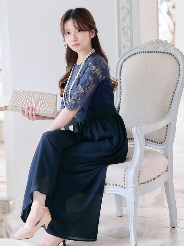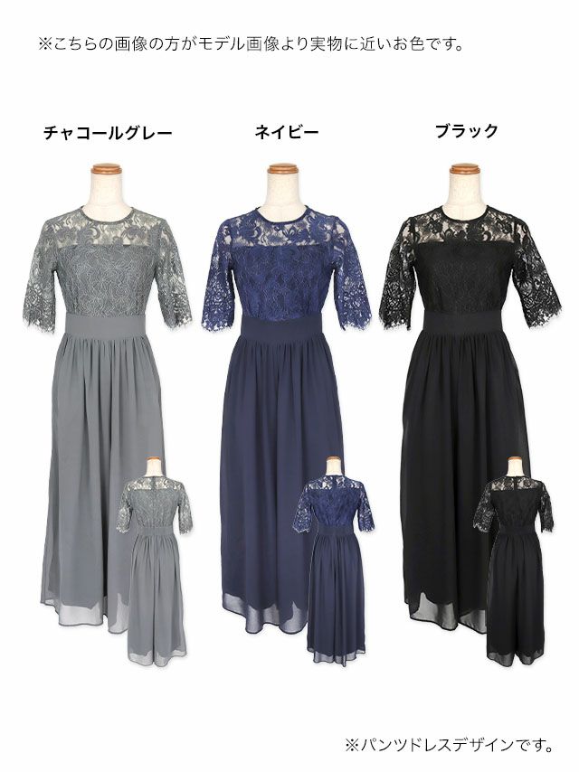 繊細なレースが上品に魅せる♪ [SALE] 五分袖レースウエストリボンセパレートパンツパーティードレス (Sサイズ~3Lサイズ)