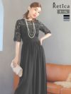 レース切替デザイン五分袖シフォンフレアロングスカートパーティードレス (Sサイズ~4Lサイズ)