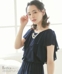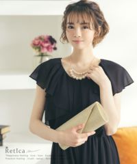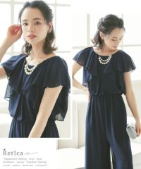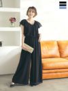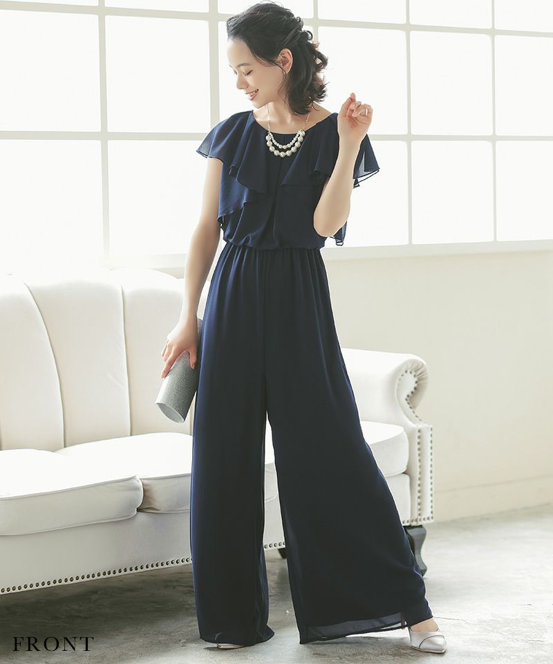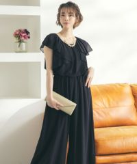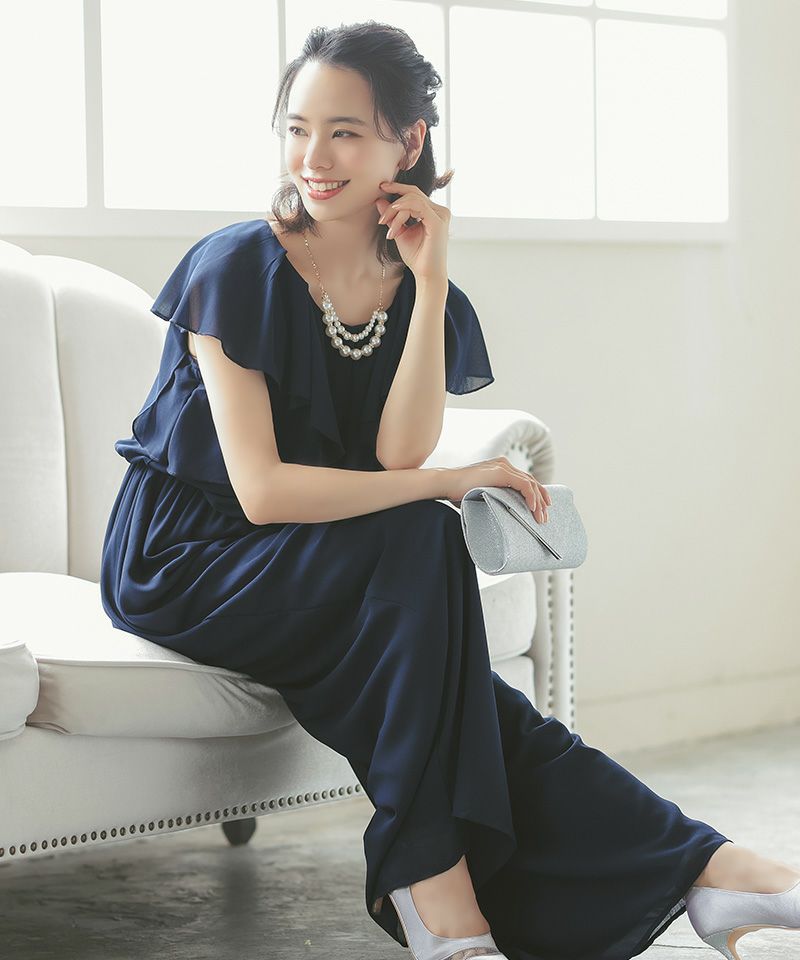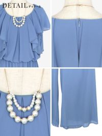 嬉しいパールネックレス付き♪ シフォンフリルデザインラウンドネックワイドパンツプチプラパーティードレス (Mサイズ~XXLサイズ)