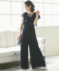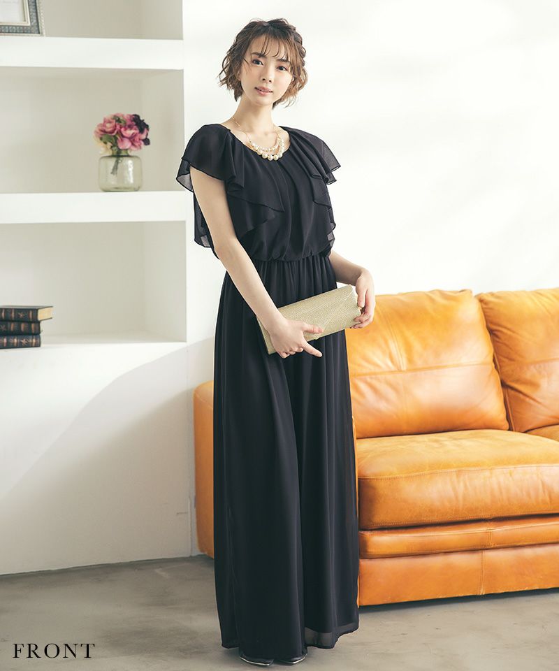 シフォンフリルデザインラウンドネックワイドパンツプチプラパーティードレスのフロント全身