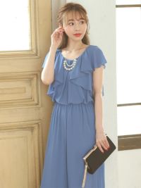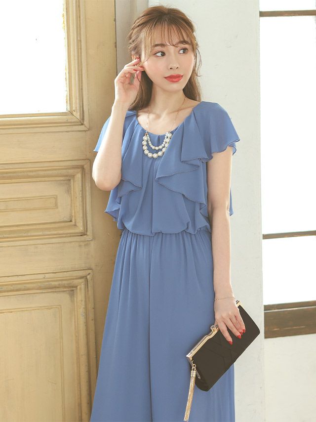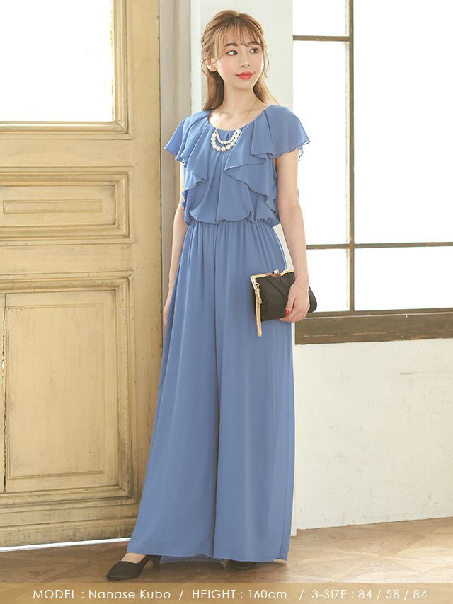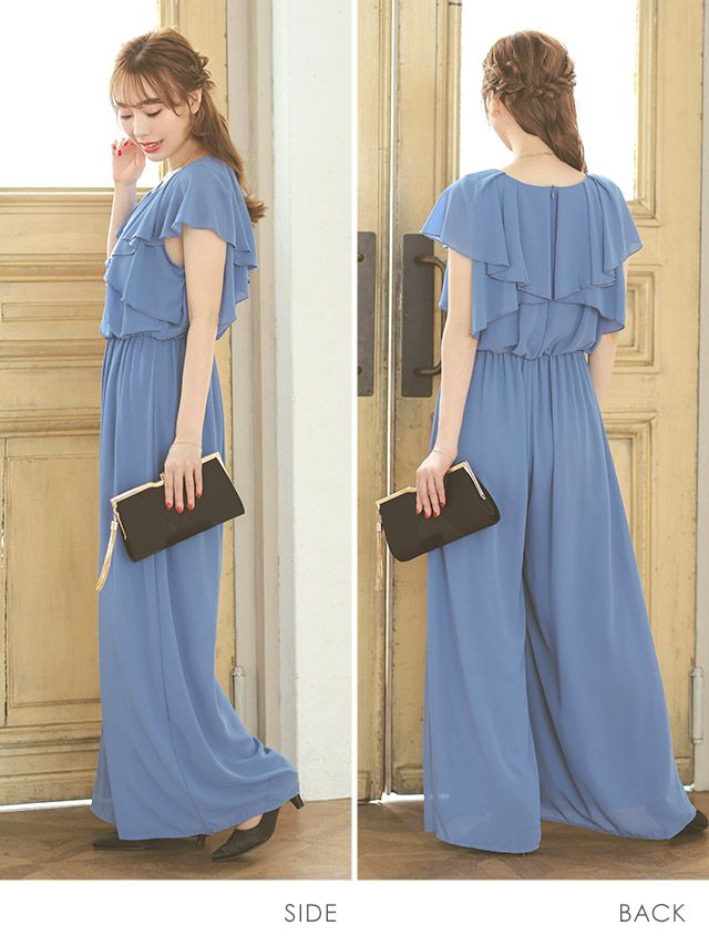 シフォンフリルデザインラウンドネックワイドパンツプチプラパーティードレスの表