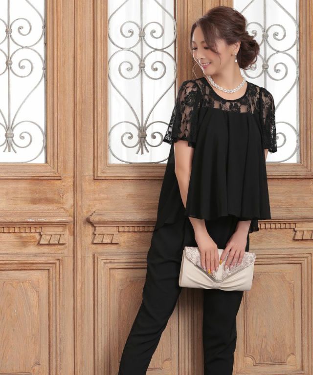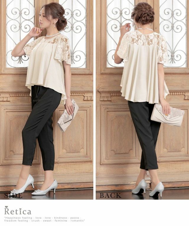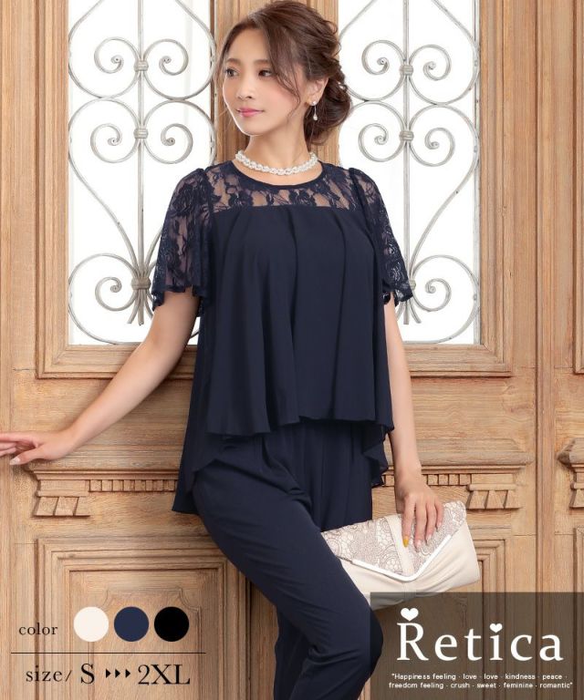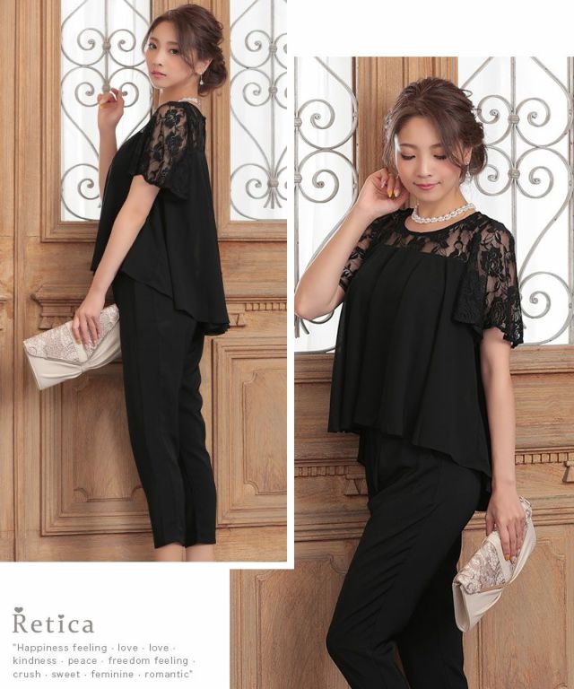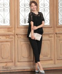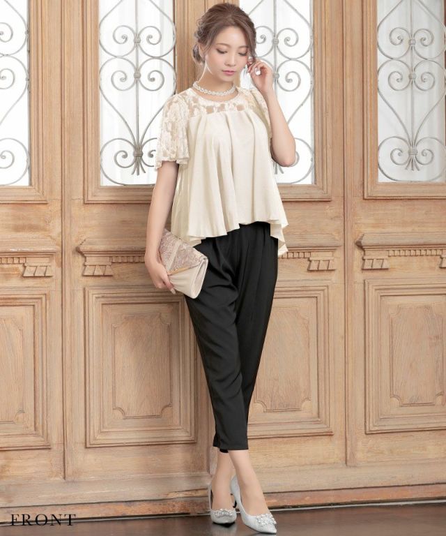 パーティードレス パンツ プチプラ 肩レースデザインゆったり半袖セットアップパンツドレス