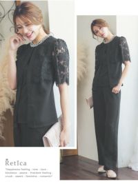 レース袖パールネックレス風デザインセットアップパンツパーティードレスのサイドバッグ全身