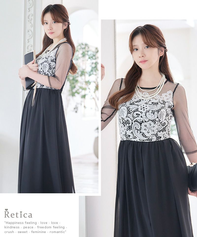 パーティードレス パンツ ラッセルレースチュールスリーブシフォンドレープワイドパンツドレス