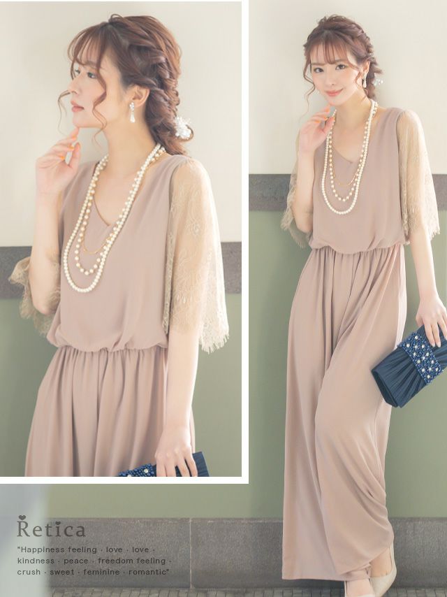 フレアレース袖Vネックラインワイドパンツプチプラパーティードレスのカラーバリエーション