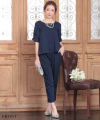 ペプラム袖ありトップスセットアップパンツプチプラパーティードレスのフロント全身