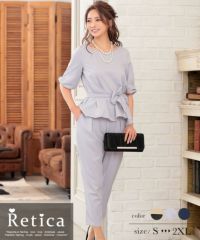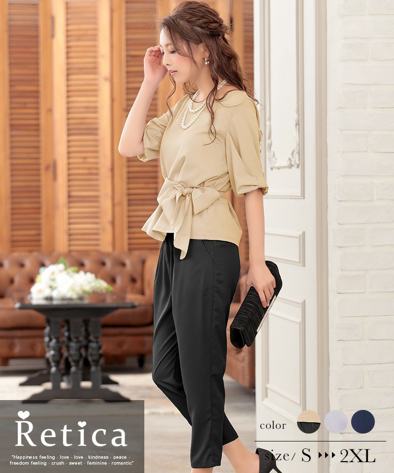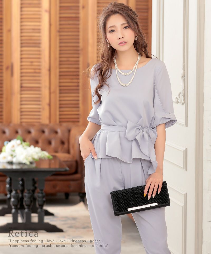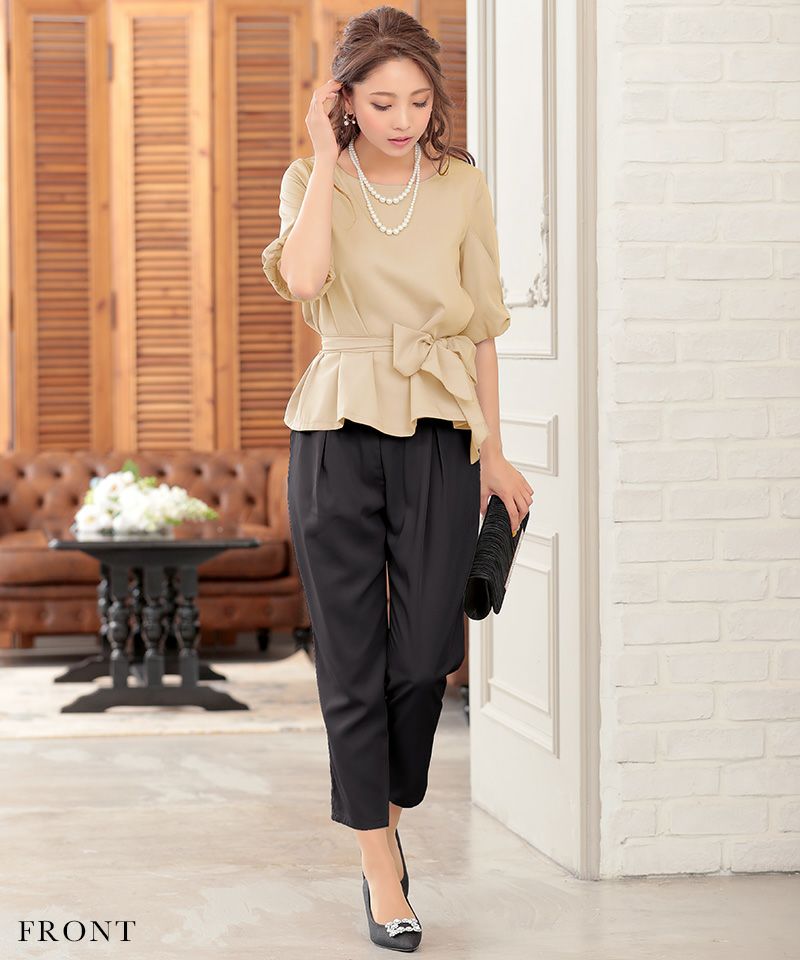 リボン×ペプラムで可愛く体型カバー♪ ペプラム風リボンベルトセットアップパンツプチプラパーティードレス (Sサイズ~XXLサイズ)