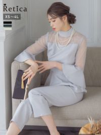 4. [SALE] ハイネック七分袖レース切り替えパンツオールインワンパーティードレス (XSサイズ~4Lサイズ)