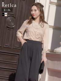 体型カバーに優れた楽々セットアップ♪ [SALE] セットアップ刺繍レース袖ありトップス×ワイドパンツパーティードレス (Sサイズ~XXLサイズ)