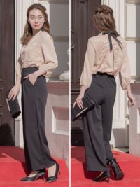 4. [SALE] セットアップ刺繍レース袖ありトップス×ワイドパンツパーティードレス (Sサイズ~XXLサイズ)