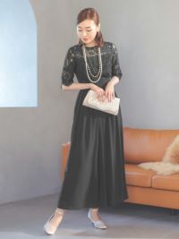 3. [SALE] チュールレースデザインシフォンギャザーワイドパンツ五分袖パーティードレス (Sサイズ~4Lサイズ)[Retica/レティカ]