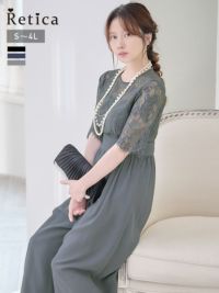 4. [SALE] チュールレースデザインシフォンギャザーワイドパンツ五分袖パーティードレス (Sサイズ~4Lサイズ)[Retica/レティカ]