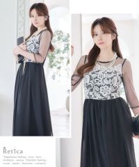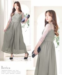 袖ラメレースシフォンフレアロングパーティードレス (Sサイズ~4Lサイズ)