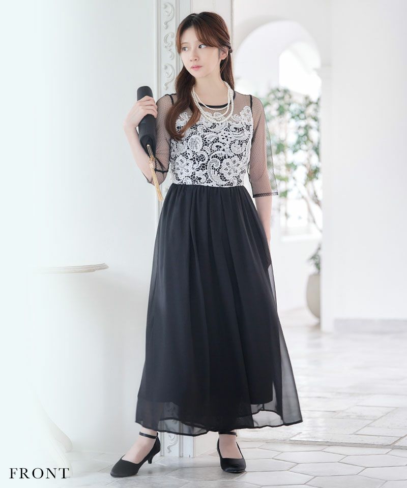 チュール刺繍フラワーロングパーティードレス (XSサイズ~4Lサイズ)<高身長サイズあり>