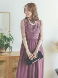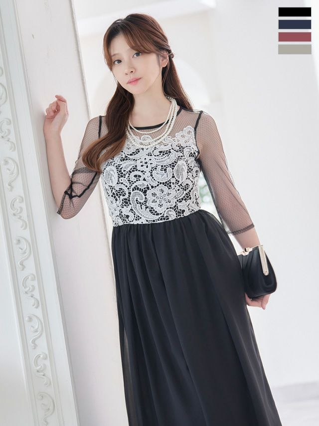 チュール刺繍フラワーロングパーティードレス (XSサイズ~4Lサイズ)<高身長サイズあり>