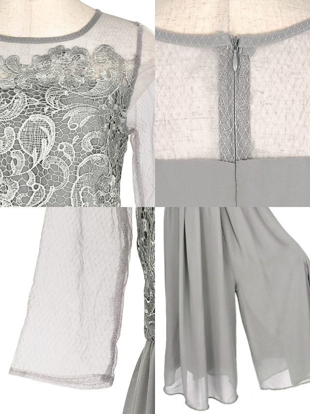 リーフ柄ラッセルレース七分袖ドレープギャザーシフォンパンツパーティードレスのイメージ画像3
