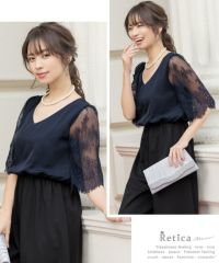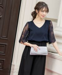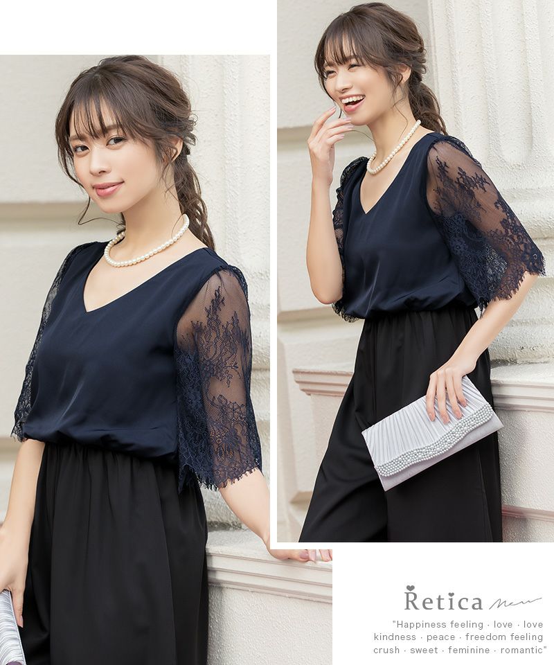 パーティードレス バイカラーレース袖パンツドレス ネイビー