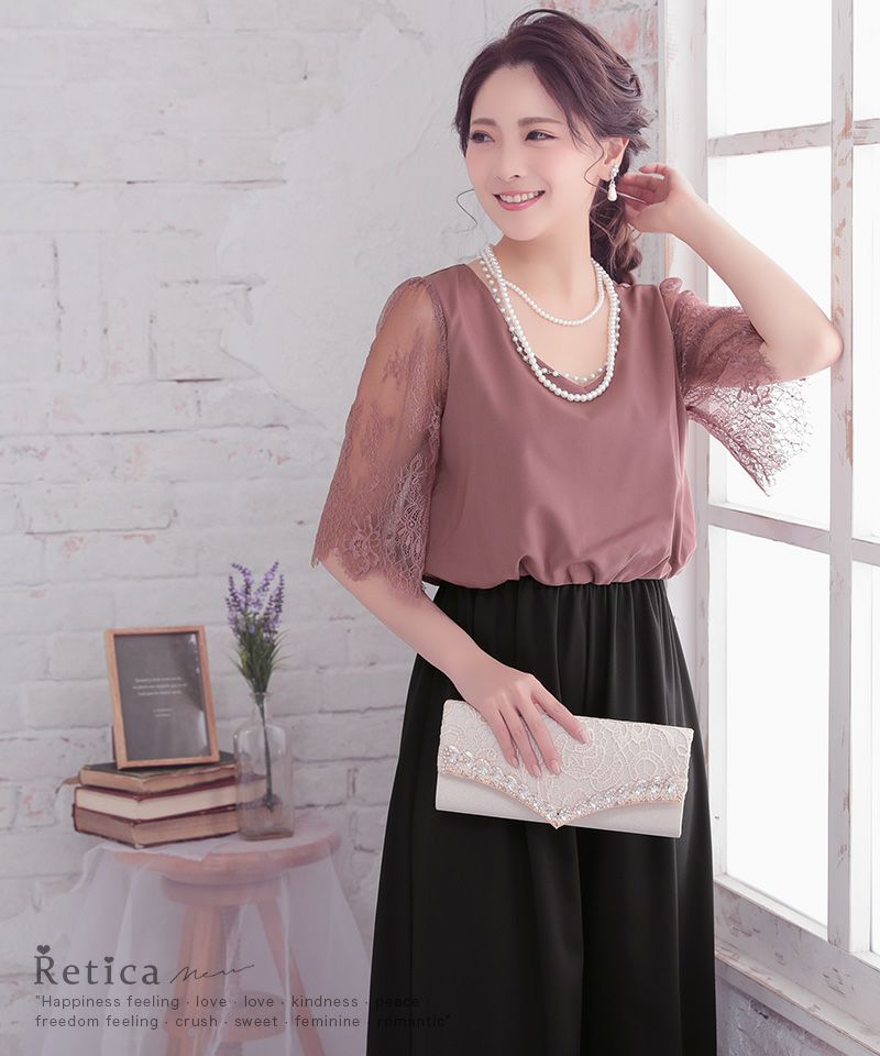 バイカラーレース袖パンツプチプラパーティードレスのサイドバッグ全身