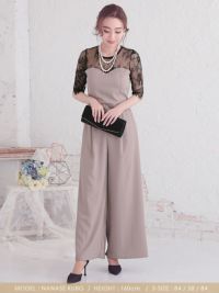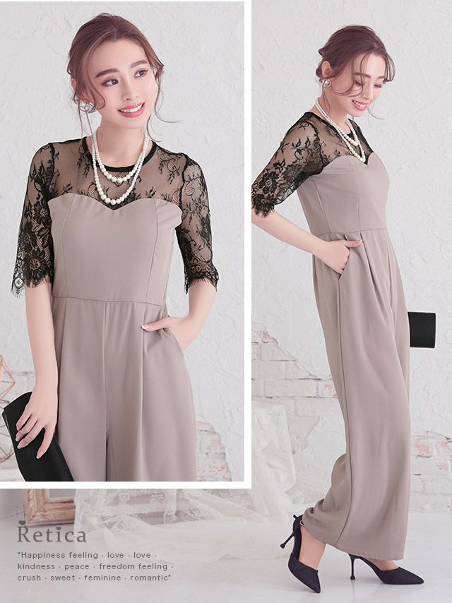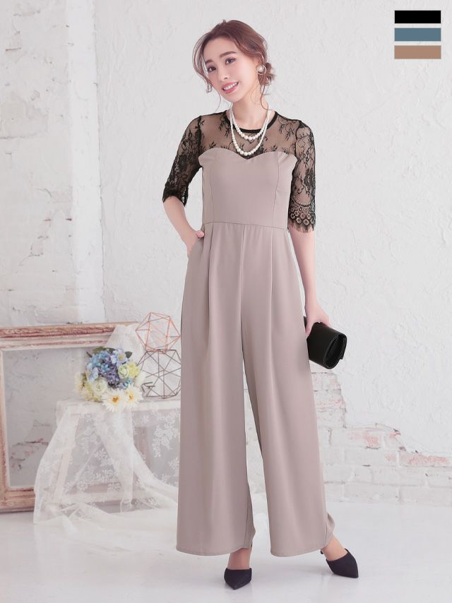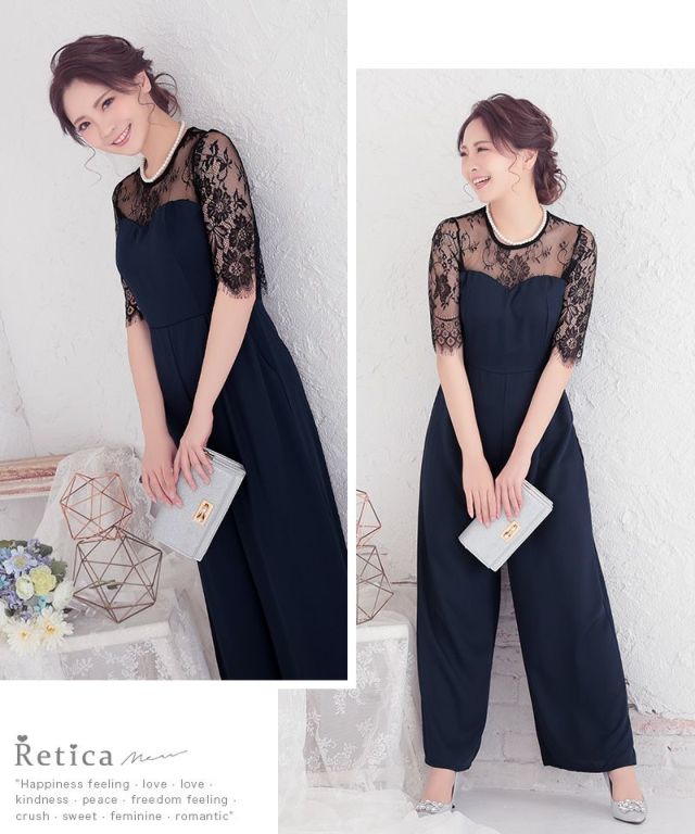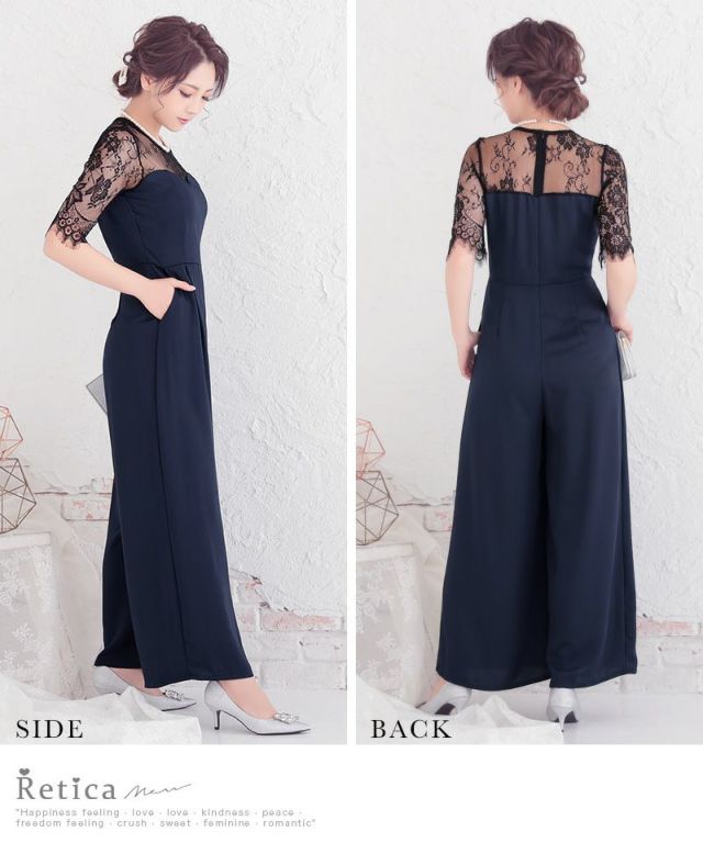 スタイリッシュで飾りすぎないパンツドレス♪ レース切替七分袖ワイドパンツパーティードレス (Sサイズ~XXLサイズ)