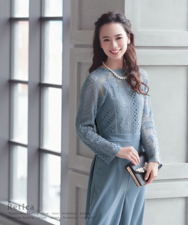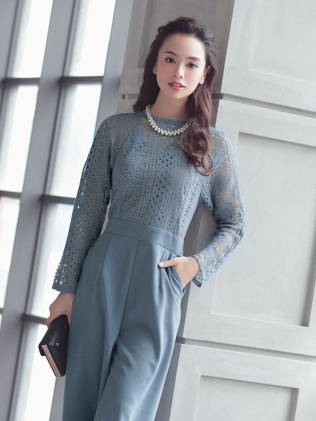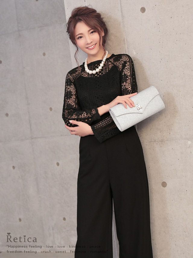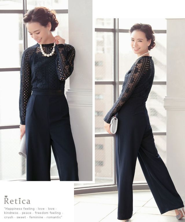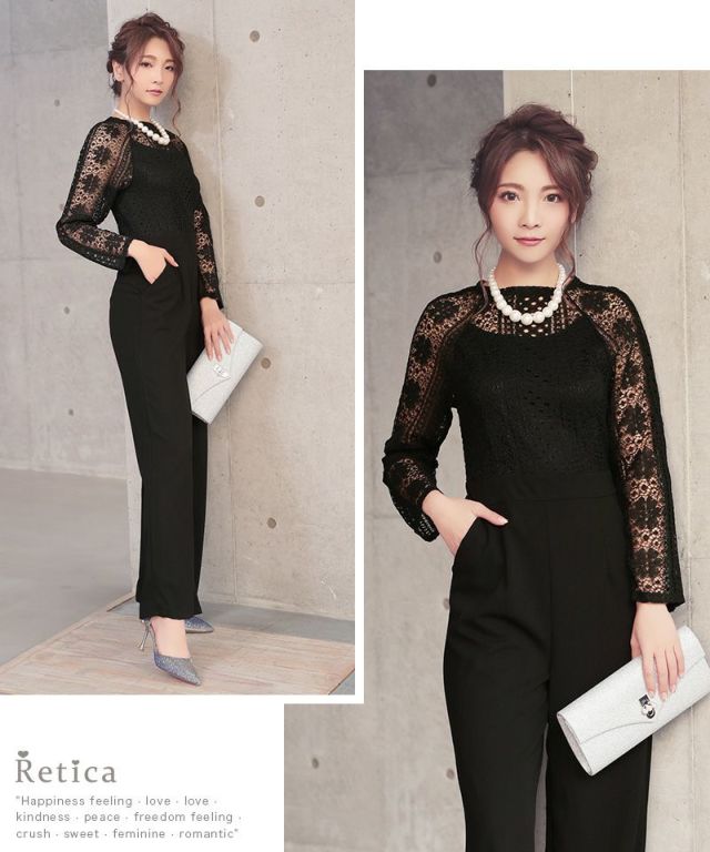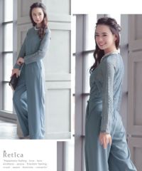 パーティードレス パンツ ロングスリーブハイネックレース切り替えパンツドレス