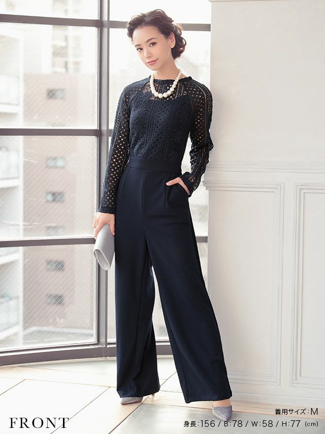 ロングスリーブハイネックレース切り替えパンツパーティードレスのフロント全身