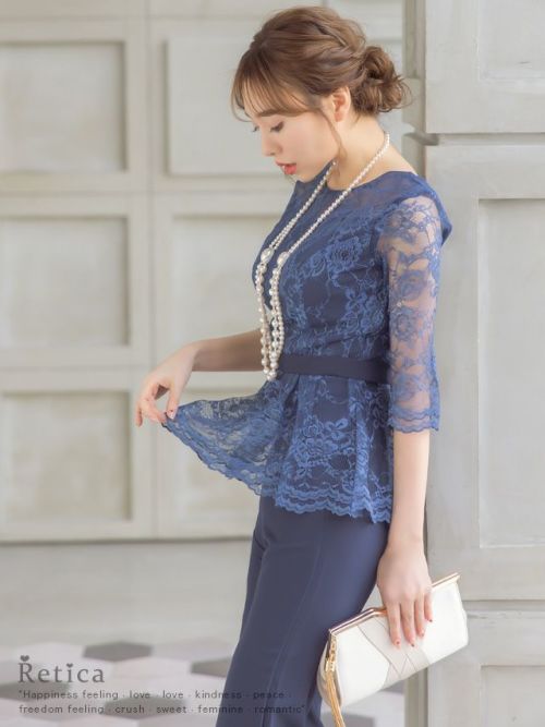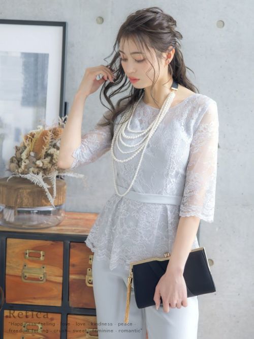ペプラムで魅せる、品格美スタイル♪ [SALE] ペプラムデザイン袖ありパンツスタイルオールインワンパーティードレス (XSサイズ~4Lサイズ)